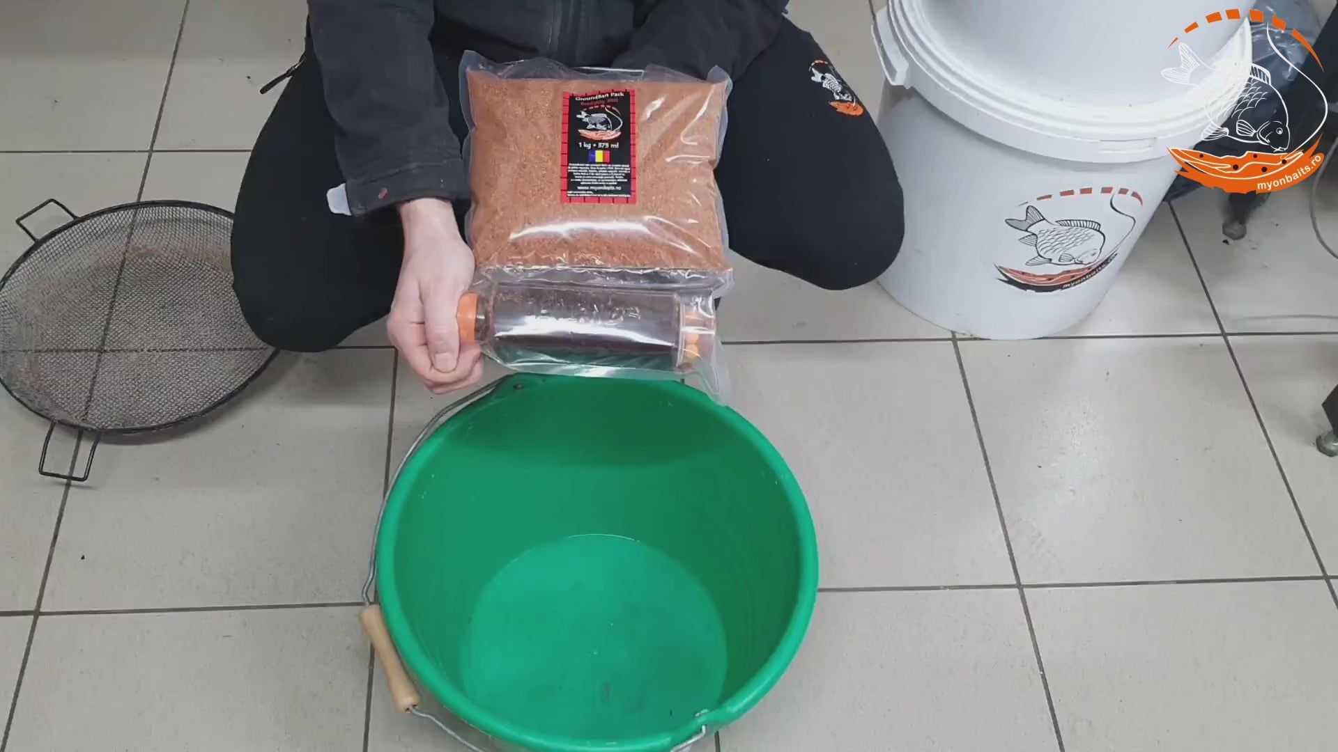 - Turnați groundbait-ul și aditivul în găleată.